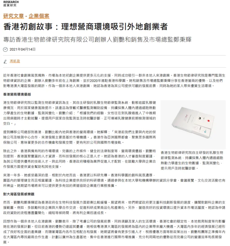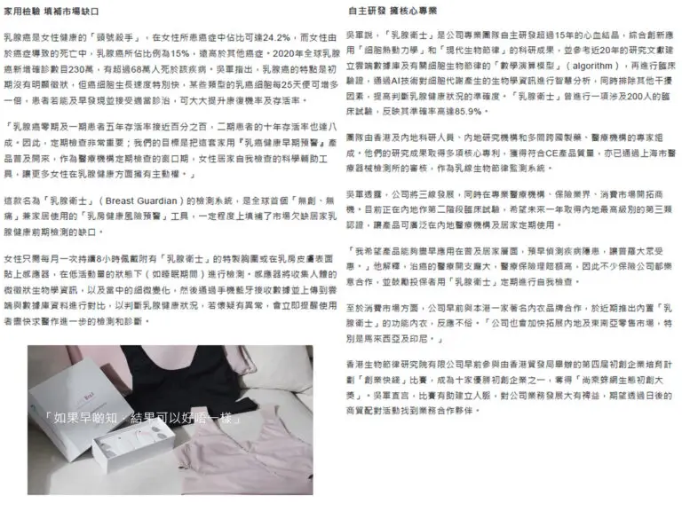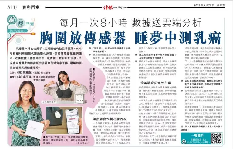 筆者最近認識新創企業「香港生物節律研究院有限公司], 已研發出一款能夠撿測乳腺健康的胸圍,這個針對質密性乳腺組織的突破性篩查方法,提供了一個無創、非放射、非壓迫、及能早發現乳癌的新方案。「人體的各種生理活動,如呼吸、 消化、體溫、內分泌等呈現相應的晝夜節律性變化。」硏發團隊指出,當一個人的生活方式與內在生理時鐘節律長期不相符,患上多種疾病的風險便會增加,例如腫瘤的發生、發展都有關係。